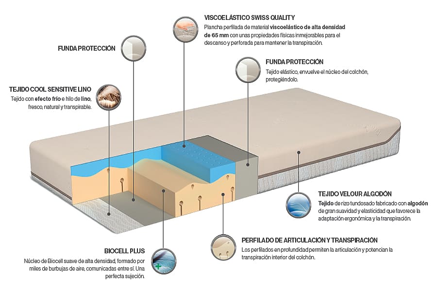 Núcleo de Biocell suave de alta densidad, formado por miles de burbujas de aire, comunicadas entre si. Una perfecta sujeción.
